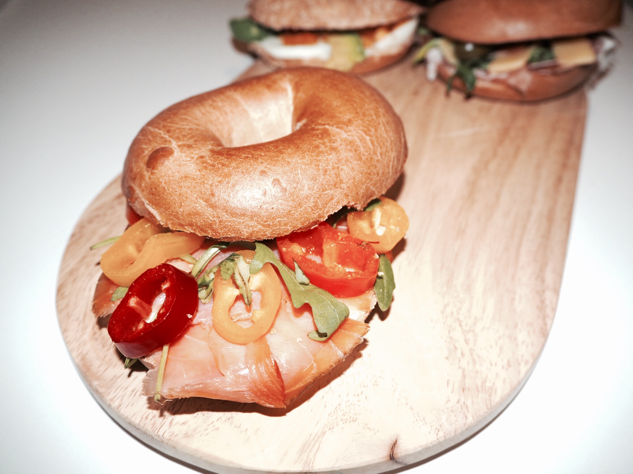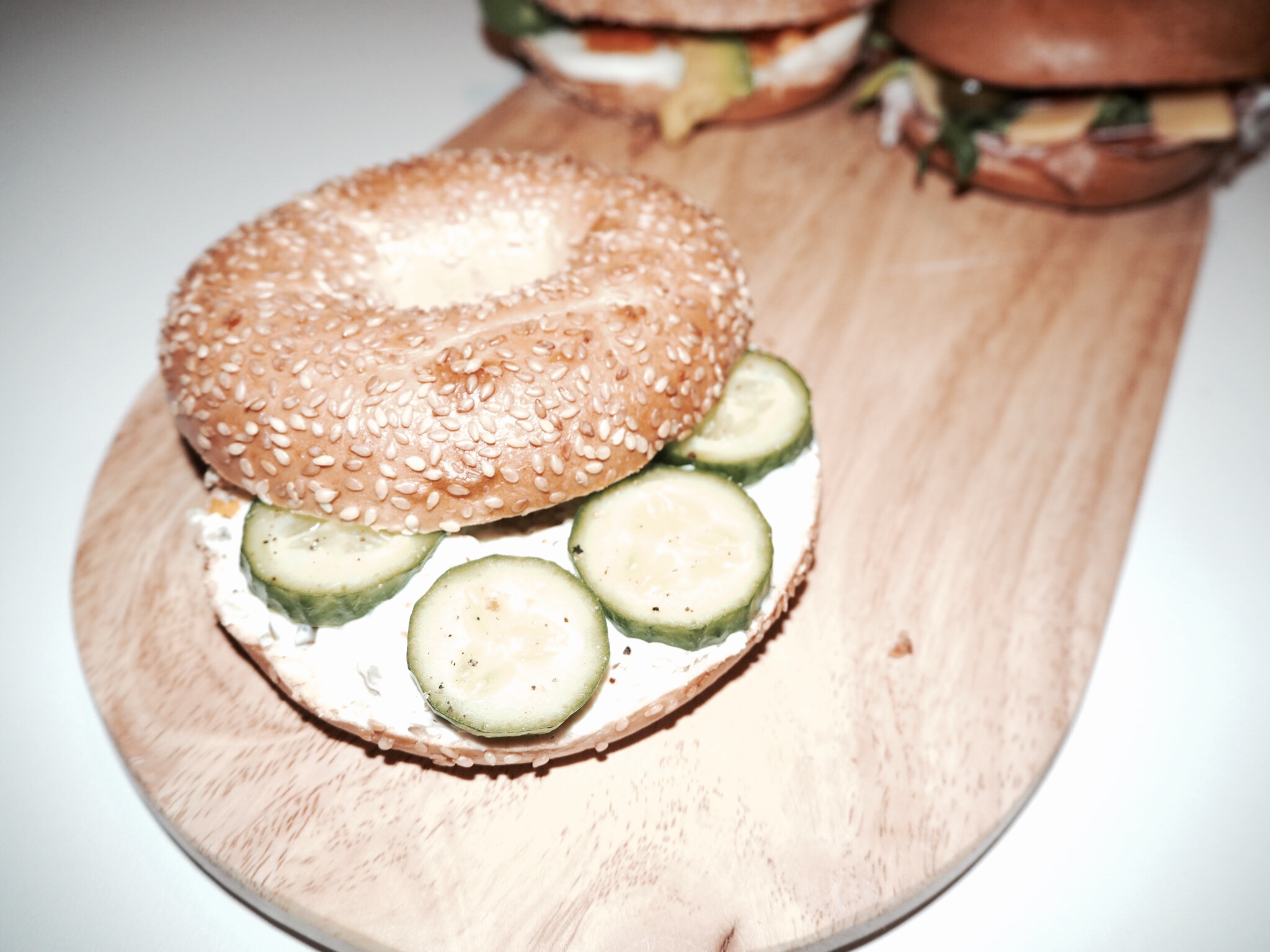 Alle Bagels in der Hälfte durchschneiden und wie Toastbrot im Toaster toasten. Falls ihr einen Klapptoaster besitzt könnt ihr sie auch gerne dort erwärmen 🙂