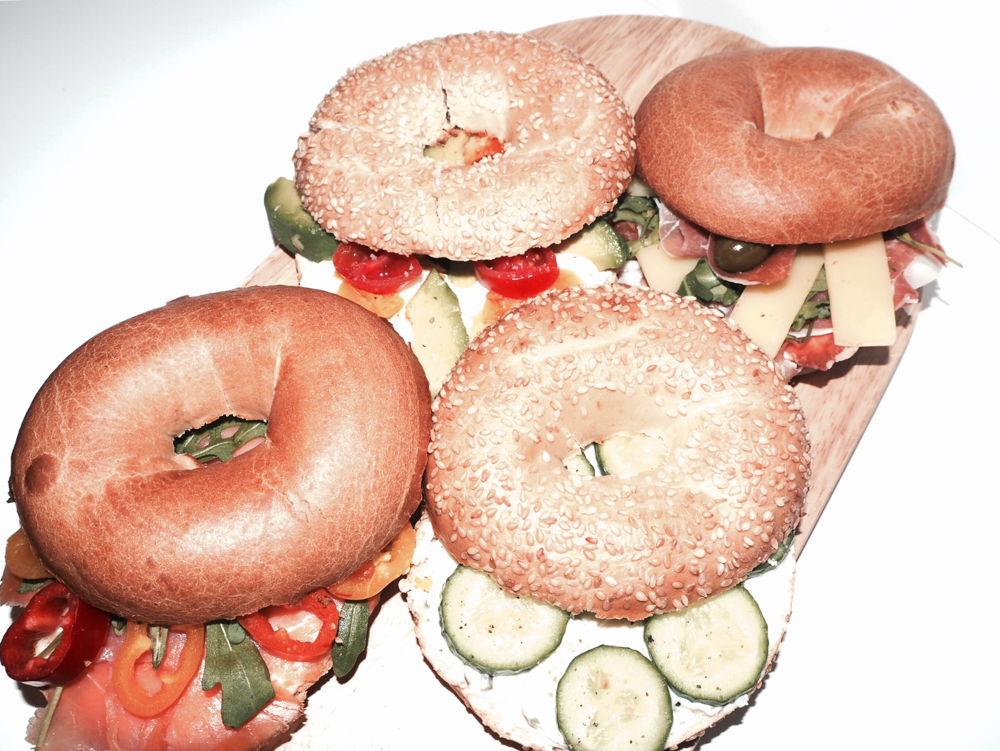 Der letzte Bagel ist mir persönlich der Liebste, schmeckt total frisch und griechisch! Ich mag Tzatziki ja auch so gerne, die Kombi Gurke mit Knoblauch und Joghurt gehört für mich noch immer zu den besten Erfindungen!